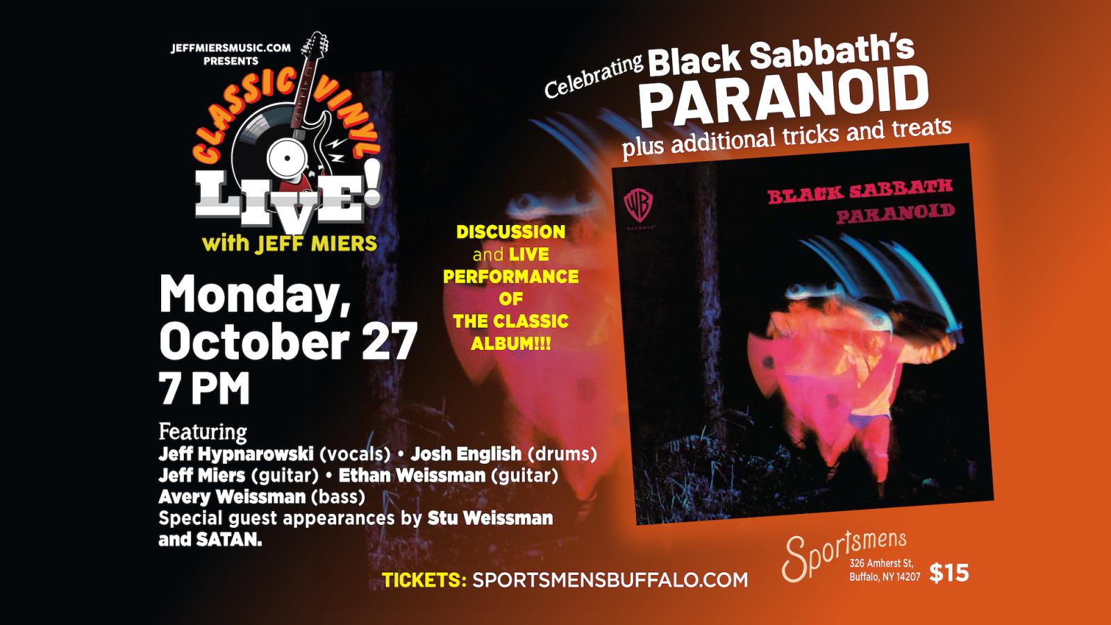 « All Events Classic Vinyl Live w/Jeff Miers Black Sabbaths Paranoid – Sportsmens October 27 @ 7:00 pm - 10:00 pm « Los Straitjackets wsg/Wasted Major A Tribute to Joni Mitchell Lauren & The Good Souls w/Special Guests – The Cave » Sportsmens presents Classic Vinyl Live w/Jeff Miers presents Black Sabbaths Paranoid Monday, October 27, 2025 7pm $15.00 Add to calendar Google Calendar iCalendar Outlook 365 Outlook Live Details Date: October 27 Time: 7:00 pm - 10:00 pm Event Categories: Genre, Rock, Sportsmens, Sportsmens, Stages Website: https://www.showclix.com/event/classic-vinyl-live-black-sabbaths-paranoid Venue Sportsmens Tavern 326 Amherst Street Buffalo, NY 14207 United States + Google Map Phone 7168747734