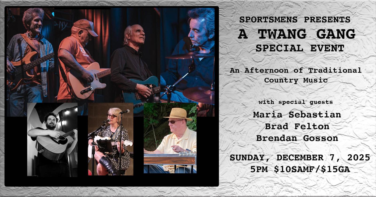 « All Events Twang Gang Pure Country Special – Sportsmens December 7 @ 5:00 pm - 8:00 pm « Analog Kids RUSH Tribute – The Cave The Empty Pockets Holiday Tour 2025 – The Cave Stage » Sportsmens presents Twang Gang Pure Country Special Sunday, December 7, 2025 5pm $10SAMF/$15GA Add to calendar Google Calendar iCalendar Outlook 365 Outlook Live Details Date: December 7 Time: 5:00 pm - 8:00 pm Event Categories: Country, Genre, Sportsmens, Sportsmens, Stages Website: https://www.showclix.com/event/twang-gang-pure-country-special Venue Sportsmens Tavern 326 Amherst Street Buffalo, NY 14207 United States + Google Map Phone 7168747734